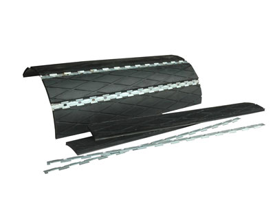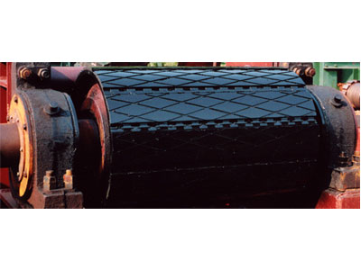 瓦殼式滾筒包膠由瓦殼式膠板、壓條組成。壓條在安裝時(shí)焊在滾筒上并壓緊瓦殼式膠板。瓦殼式膠板由耐磨膠層和金屬層熱硫化而成,厚度有12mm、15mm、20mm三種規(guī)格。